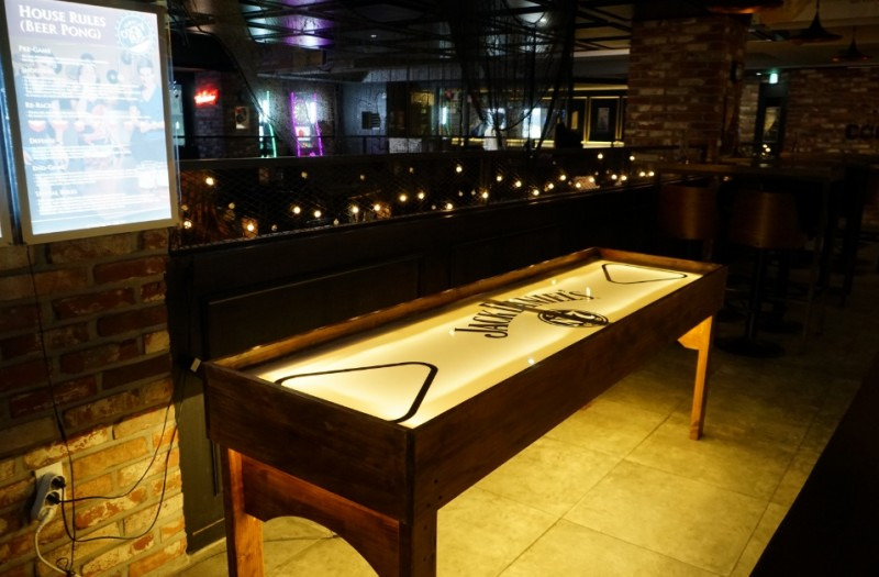 블랙톤의 인테리어와 곳곳에 걸린 유니폼, 스포츠 굿즈 등으로 꾸며져 있으며, 외국인 손님이 많아 이국적인 느낌이 강합니다. 자유롭게 돌아다니며 게임(비어퐁 등)도 즐길 수 있고, 테이블 형태도 다양해 단체 모임이나 데이트 모두에 적합합니다 - 음식과 주류